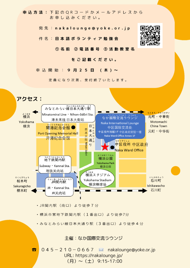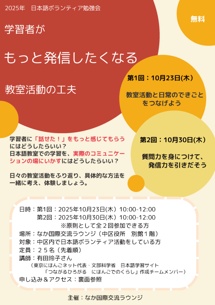 10/23・30開催「日本語ボランティア勉強会」を開催します。/なか国際交流ラウンジ 横浜市・ラウンジの情報 2025.10.15 -なか国際交流ラウンジの情報ですー 中区で日本語ボランティア活動をされている方を対象に「日本語ボランティア勉強会」(10月23日、30日)を開催いたします。 『学習者がもっと発信したくなる教室活動の工夫』 講師:有田玲子さん(東京にほんごネット代表) 学習者に「話せた!」をもっと感じてもらうにはどうしたらいいでしょう。一緒に考え、体験しましょう。 ※申込受付中。詳細は以下のちらしをご覧ください。
